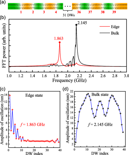 我们研究了一维磁畴壁(磁孤子的典型代表)赛道晶格的集体动力学,这些磁畴壁受到缺口钉扎势和畴壁之间相互作用势的共同作用。我们把畴壁的动力学方程映射到Su-Schrieffer-Heeger (SSH) 模型,通过分析拓扑不变量Zak phase, 我们发现系统中存在两种不同的拓扑相。位于带隙中的拓扑边界态振荡频率只取决于钉扎缺口的形状,而不受材料缺陷和无序的影响。钉扎势的弹性系数从而可以通过精确确定的边界畴壁振荡频率和畴壁有效质量来得到。微磁模拟很好的验证了我们的理论结果。本文提出了一种精确测量磁孤子振荡频率的新方法,并表明磁孤子赛道除了作为一种新兴信息存储单元,还能用来有效地研究物质的拓扑相和拓扑相变。
